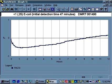 After the test has been running for approximately 10 minutes, if desired, histograms can be viewed by selecting the "Histogram" command on the toolbar or from the "Histogram Menu", select "Show Histogram". Histograms can only be viewed during the "Performing Test" mode of operation. The "Histogram" shows the current reading for all conductivity measuring test tubes in relation to each other for that test. The scale will automatically change as the largest reading gets bigger or smaller. So the largest reading will generally appear to be the whole height of the graph. Remember that the purpose of the Histogram is to show 'current state relative performance'. Graphs show conductivity measuring test tube histories (traces) against other conductivity measuring test tube histories (not necessarily from the same test). Indeed traces from previous tests (i.e., test stored on the hard drive) can be shown on the same graph and a single trace can be shown on multiple graphs.