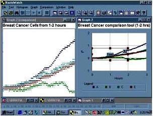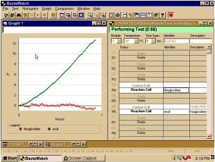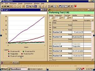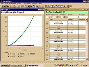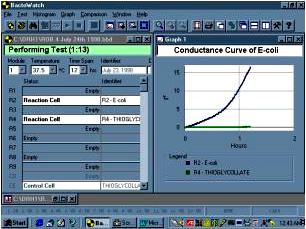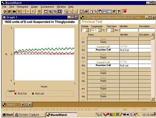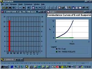 Materials and Methods: The PC-based Bactobridge H3 can be used in a Laboratory Information System (LIS) to collect both graphical and numerical data necessary to analyze a wide spectrum of foodborne and malignant diseases (i.e., cancer) in both the human and animal populations. The Bactobridge H3 comprises module blocks, each containing up to 20 conductivity measuring tubes maintained at a controlled temperature and time, which can be pre-set by the user through a Windows 95/NT software application called BactoWatch. The Bactobridge H3 and its associated system, includes a PC workstation that can electronically link up to 15 such modules with a total of 300 conductivity measuring tubes, which allows up to 270 dependent or 150 independent tests to be conducted, simultaneously. In the conductivity measuring tubes of the Bactobridge H3 the electrical conductivity of a test sample is continuously compared with the conductivity of a control sample in an impedance bridge circuit in which the test and control samples form opposing arms. The two samples are contained in a pair of conductivity measuring tubes, which are closely matched in their physical properties. In the impedance bridge circuit, an unknown is balanced against a standard for precise measurement of the electrical current (conductivity) of the medium. A 6-8 kHz rounded square wave from an oscillator designed to have less than 0.1% total harmonics activates the bridge circuit within the Bactobridge H3, resulting in virtually no DC component to the drive voltage. The sense system applies very small DC voltages and extremely small currents. The purity of the rounded square wave signal to the bridge and maintenance of the voltage below .5 volts peak to peak across the conductivity measuring tubes reduces the possibility of any polarization effect. The internal diameter of the conductivity measuring tubes varies from 6.20 to 6.23mm. The robust conductivity measuring tubes have a capacity of 3.5 ml and are autoclavable, and simple to fill using pipetting techniques. Bacterial tests have been performed using 150,000, 30,000, 1,500, 500, 250, 10, 5 and 1 E-coli suspended in enriched thioglycollate (Becton Dickinson). To determine viability cell count for E-coli, Ur et al and Alonsozana et al compared their solutions with the 0.5 McFarland Standard, which is an equivalent of 1.5 x 108 organisms per ml. Cancer tests were performed with 1-2 x 106 MCF-7 human tumor cells suspended in RPMI 1640 and Hank’s balanced salt non-nutritive solution. Viability and cell count was determined for cancer cells by the trypan blue dye exclusion assay on a hemacytometer.