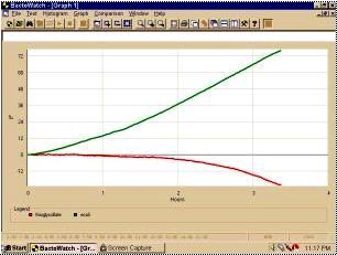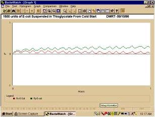 Changes in pH occurring in the medium in the conductivity measuring tubes can cause changes in conductance but the sensitivity of the Bactobridge H3 detection system allows recognition of bacterial growth before changes in pH due to that of growth take effect Typically in microbiological studies of E-coli, the control sample would be a sterile nutrient medium (i.e., thioglycollate) and the test sample would be the same medium inoculated with the studied microorganism. Small inoculi, such as 10 bacteria per ml in the conductivity measuring tubes do not disturb the bridge balance. Inoculi, of about 102 microorganisms per ml or more offset the balance of the bridge in a way, which enables immediate estimation of the number of microorganisms in the inoculum. The effective, homogenous, low frequency conductivity of whole cells increases as the culture cycle progress. Walls from cells harvested early in the culture cycle are more dense and have more titratable carboxyl groups per unit volume, lower conductivity than walls from cells harvested from cultures approaching stationary phase of growth. The dielectric constants of fresh and aged cells are virtually identical over the entire frequency range. Only the low frequency conductivity changes. One simply says that the conductivity of the cell wall of the aged cell is greater than that of the fresh cell (10).