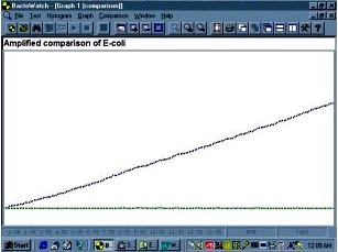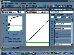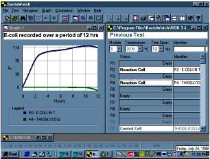 After extensive tests in both clinical and industrial laboratories, it appears as though the major advantage of the Bactobridge H3 over existing technologies is that there is no long incubation period necessary to grow bacteria or to cultivate tumor cell lines. Accurate and quantitative bacterial level determinations can be conducted very rapidly. The metabolic activity of 1,500 E-coli was detected within 15 minutes, while with an inoculum of less than 5 x 100 organisms the activity was detected in approximately 45 minutes. For most tests it is unnecessary to plot the entire conductance curve, so greater amplification of the signal could be used to allow closer analysis of the early parts of the curve. The activity of E-coli is obvious in less than 1 h when amplified, non-logarithmic scale is used; this contrast with the 2 h required, where the amplification is much less and the scale logarithmic. Similar curves have been observed with other organisms, but the speed and magnitude of response varied (6).